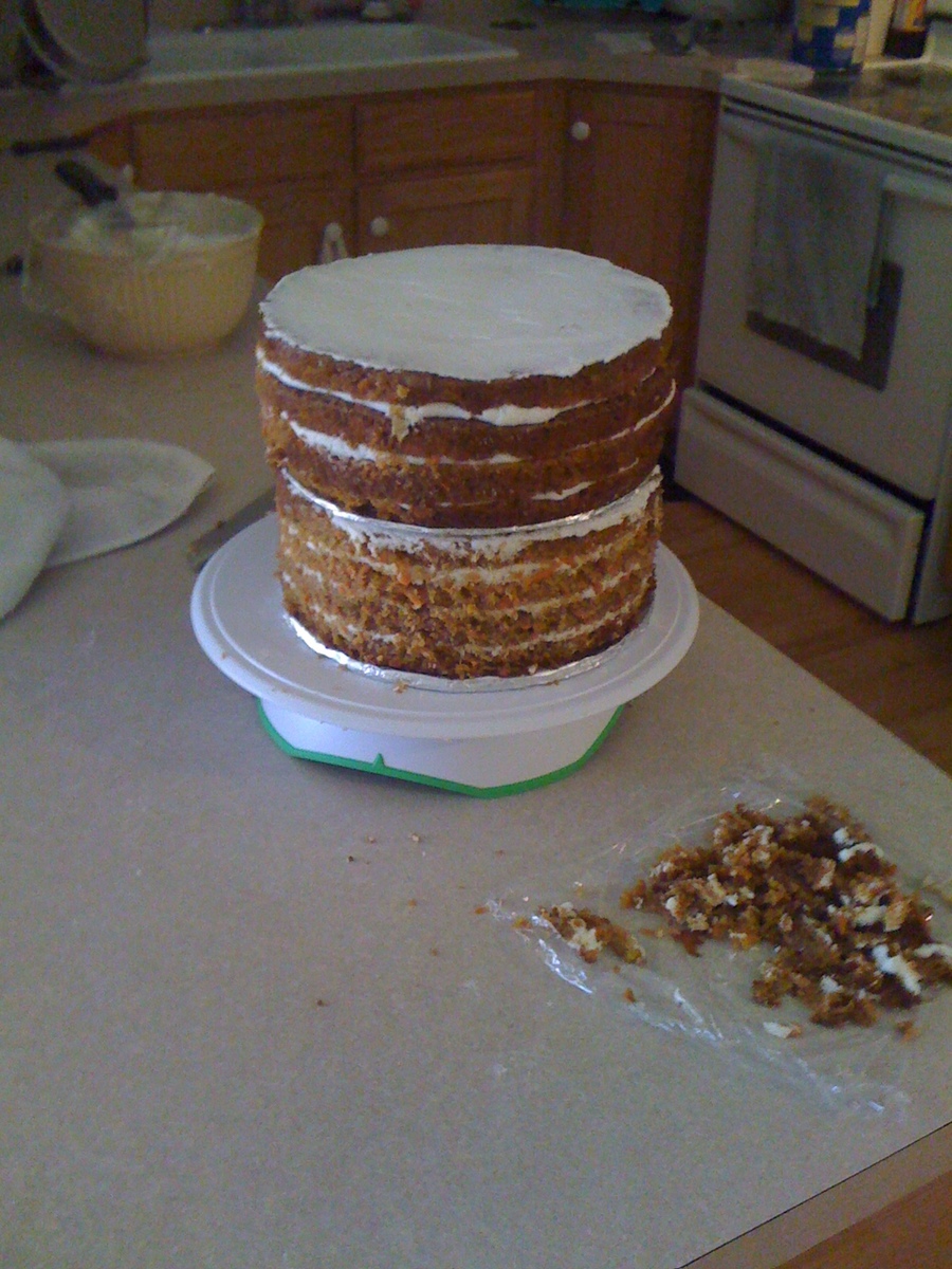 This cake was an absolute nightmare :P The bride wanted it 7" tall, and after researching I decided that i should put a support board and dowels after the bottom 3.5". I used bubble straws the... ahem... first attempt, but the cake was carrot cake and was too heavy and it collapsed on itself at 1:30 AM the day the cake was due.... SO i started from scratch, worked all night and day and delivered this beauty at 5:00 PM. It turned out ok, but I don't know if I'll ever want to do another wedding cake.