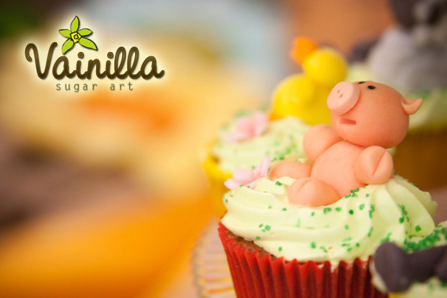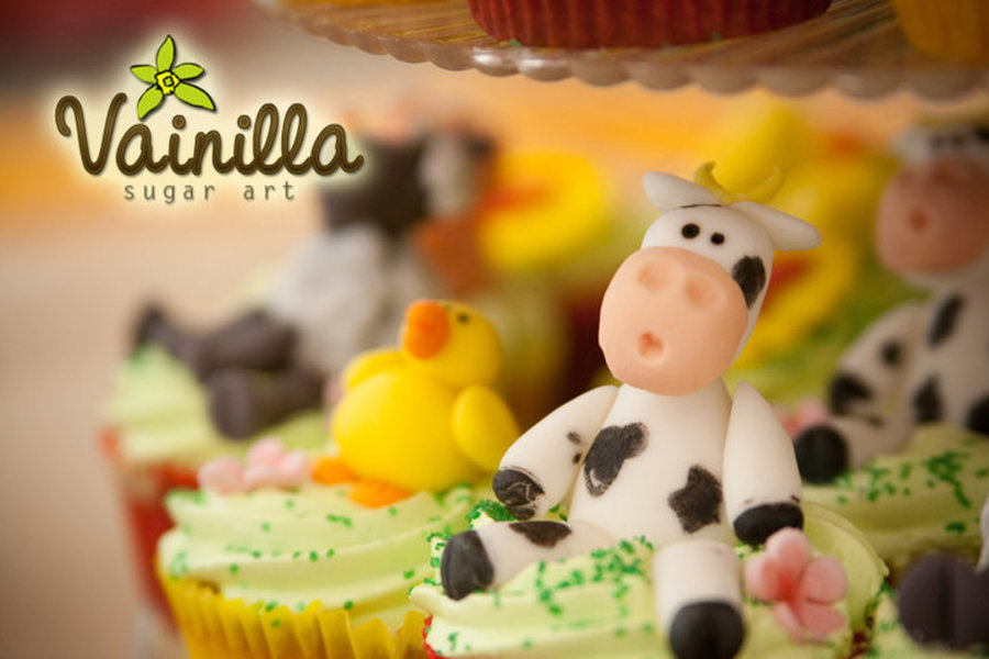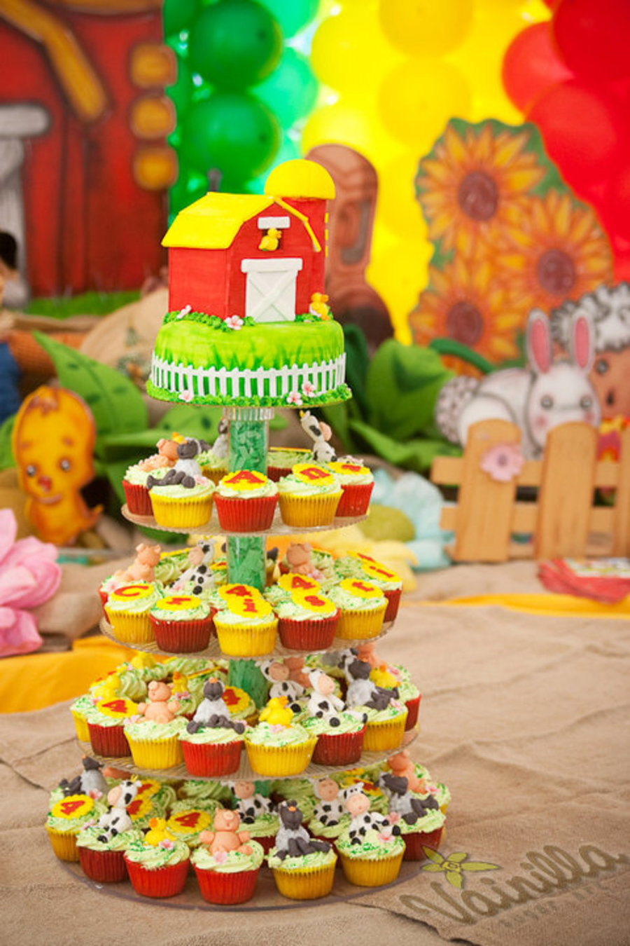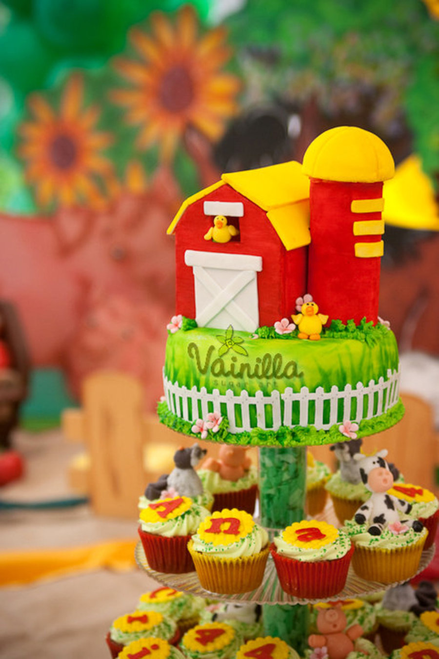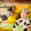 Farm themed cupcake tower. Cupcakes where vanilla with italian meringue swirls, the animals are gumpaste. the top cake was vanilla filled with nutella, covered in fondant. the barn is also made out of gumpaste.