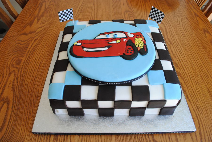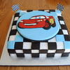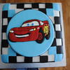 My grandson's 3rd b-day cake. Lightning McQueen - first time making a colour flow plaque.