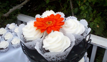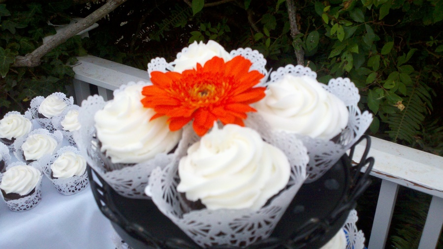 My first wedding cupcakes. The bride made it really easy on me, chocolate cake with a white swirl.