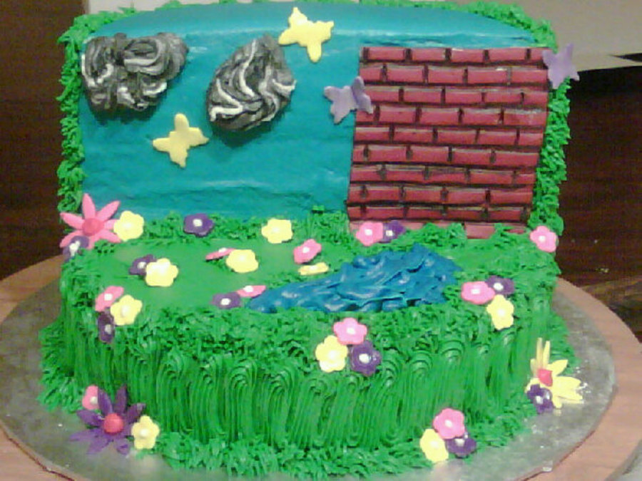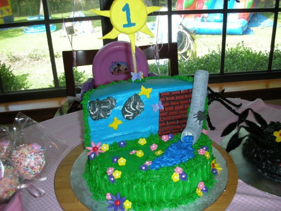 I did this cake for my niece's 1st birthday. The main cake is made with BC. Accents are with MMF. Water spout is made from PVC pipe covered with MMF. The spider smash cake is made with black (at my sister-in-law's request) BC & MMF accents. This cake was really fun to make. Thanks to my hubby for helping with the MMF brick wall, sun & water spout!