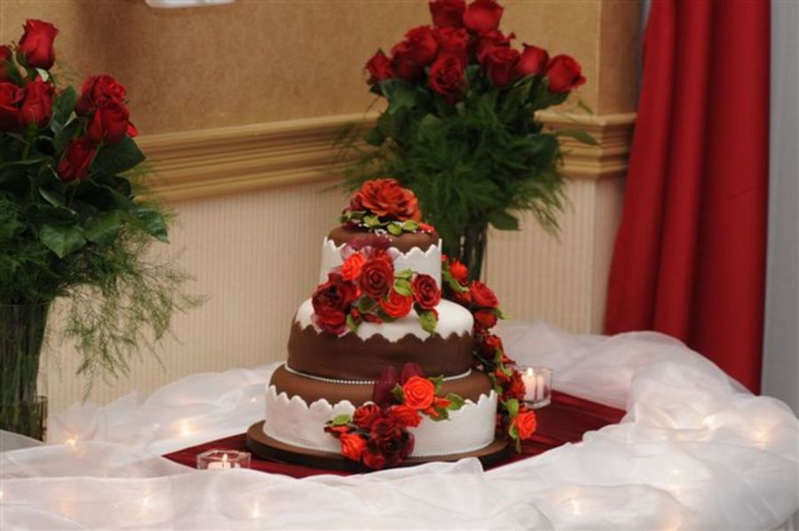 White and chocolate fondant cake; chocolate cake with chocolate ganache and caramel fillings. Roses are gumpaste.