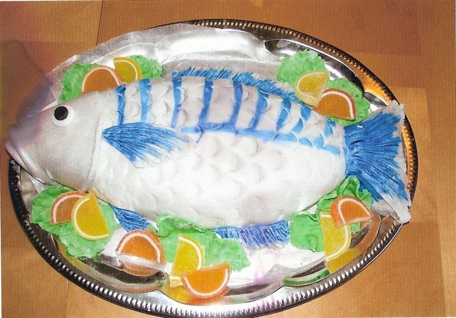 covered in fondant, scales made with wide end of a decorating tube while fondant was still soft. Painted with blue and silver luster dust mixed with vodka. lettuce is fondant, orange and lemon slices are candy/ gummy