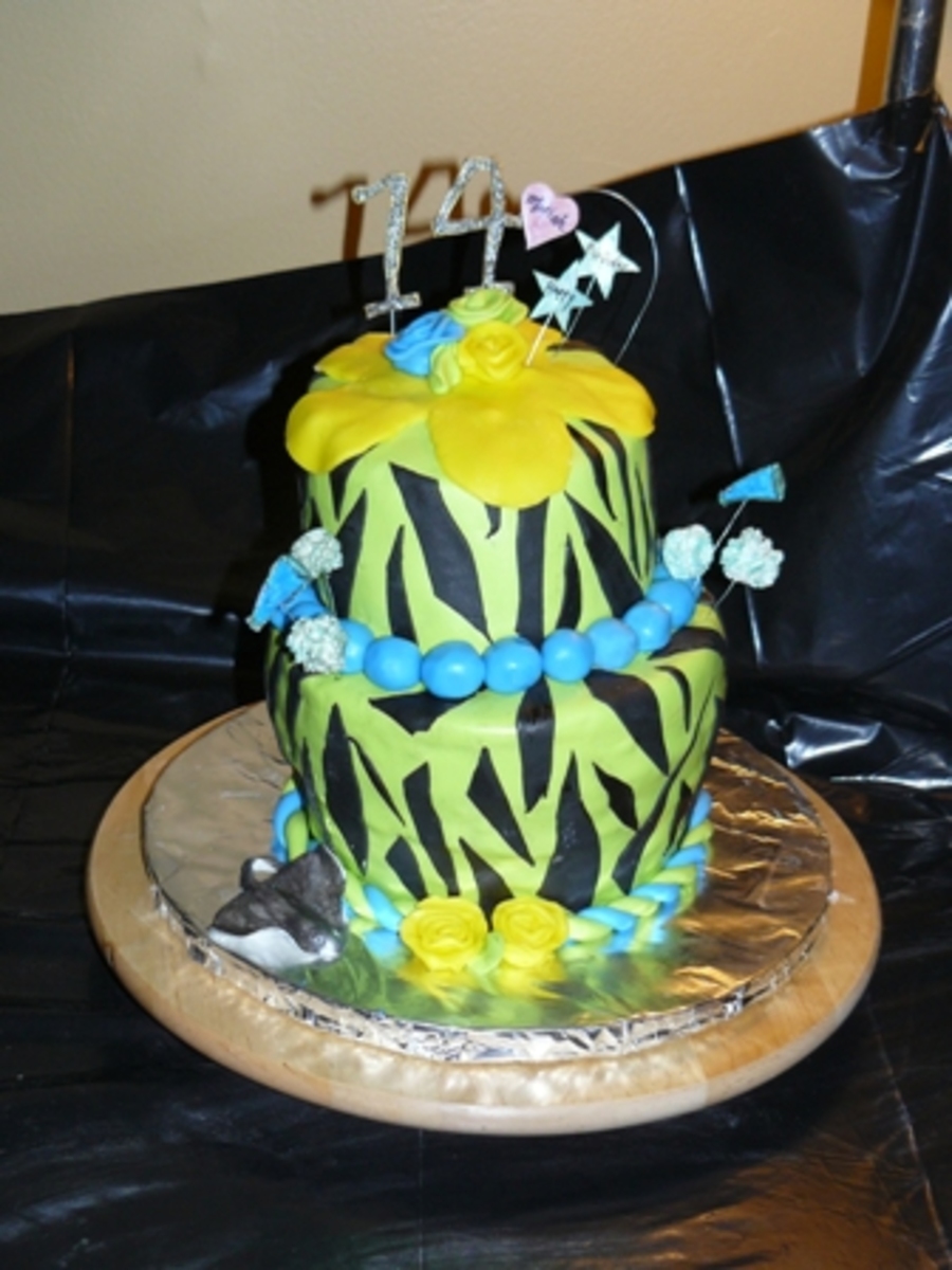 Cake inspired by a cake on CC, sorry don't remember who the designer is. please don't take offense. The birthday girl picked it out and wanted a TON of things changed on it, color palette, etc. So, I took the original cake and made it into something special for her. She turned 14. The numbers are RI piped to make it look like tiny bars of gold and filled with tiny pave' set diamonds. Then I added megaphones, and pompoms on each side. I changed the assymetrical flower on top to just a few hand rolled flowers, The fondant stingray is the mascot for her travelling competition cheer squad, the Stingrays... The cake is White Velvet cake that was colored to be rainbow (can you say "time consuming!!) Then it was carved and torted, filled with whipped white chocolate ganache. for extra awesome flavor, then crumb coated with white chocolate, cream cheese, butter cream icing. Finally I colored Fondarific and covered the cake in that. I had hear how "easy" it is to work with. But, I didn't find that at all!! It kept ripping and falling apart. It was just NOT the fondant to use in hot weather!! Any suggestions on a better workable fondant would be greatly appreciated!! TFL!!