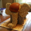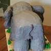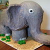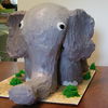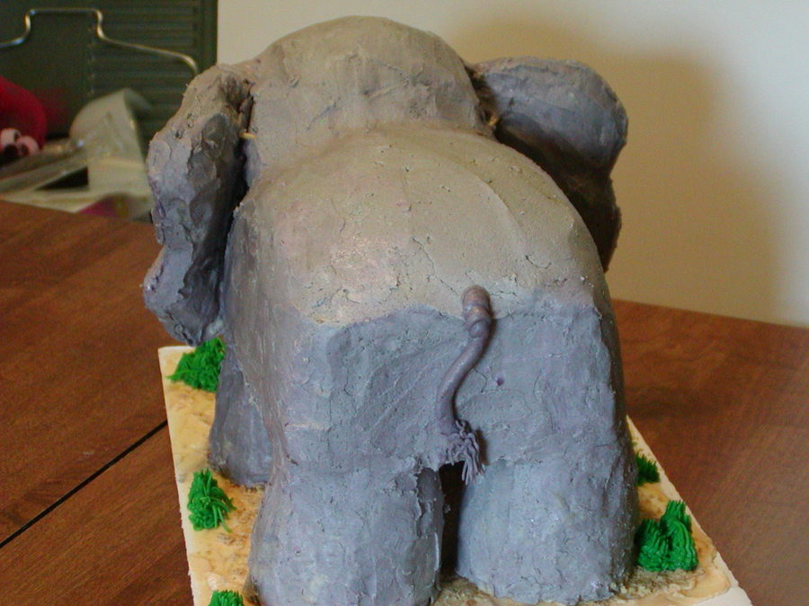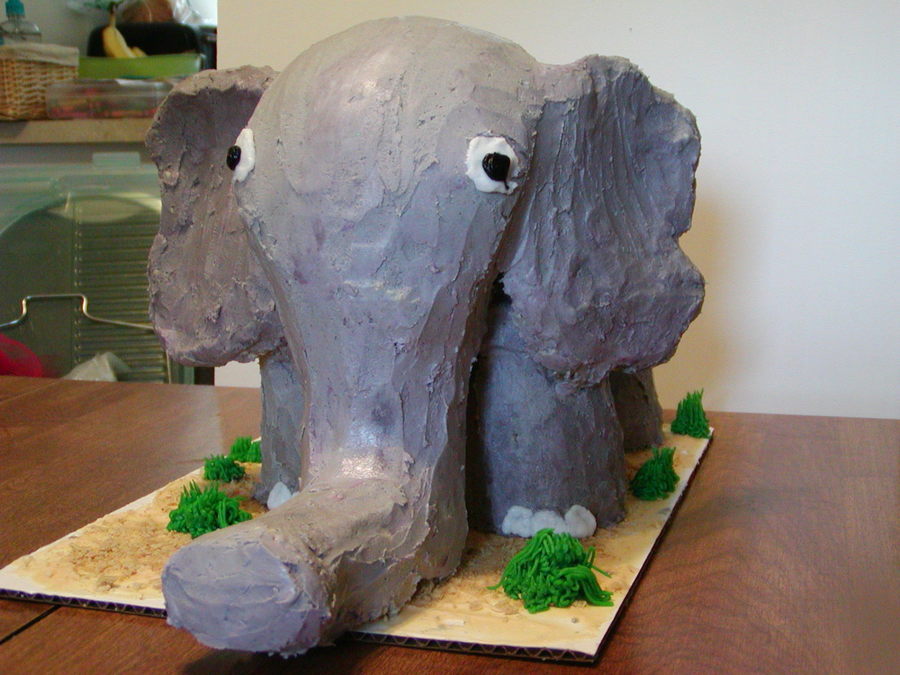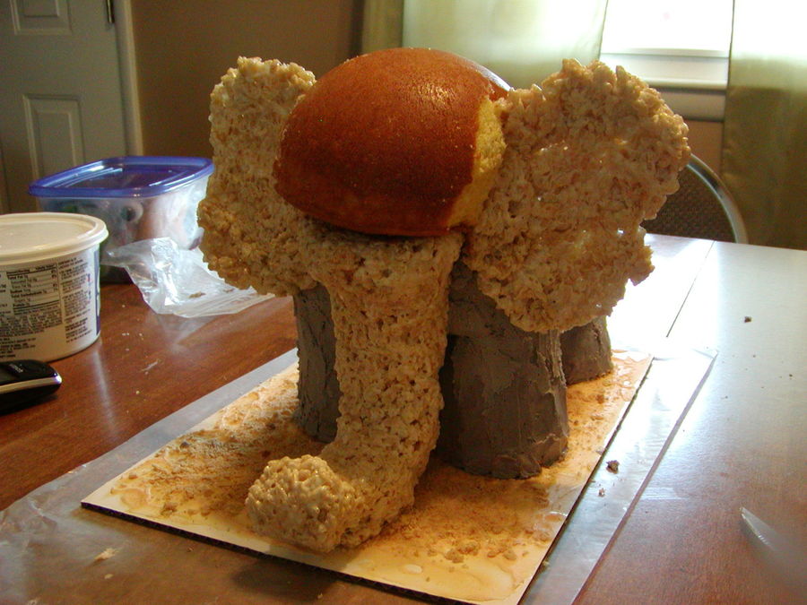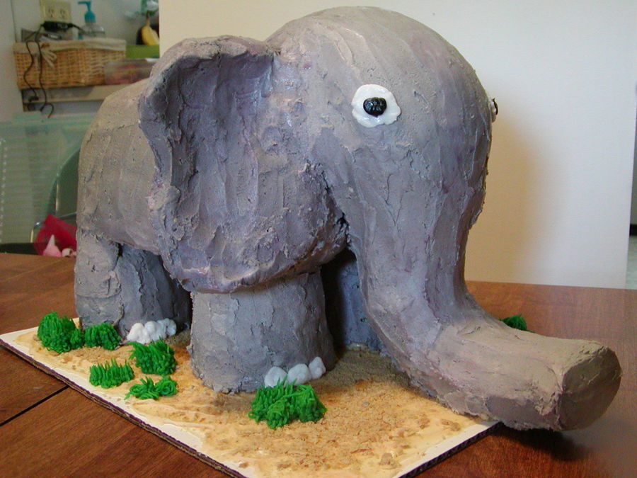 The body is a 9x13 cake cut in half and stacked, and the head is 1/2 a ball cake cut on the sides. The legs, ears and trunk are RKT. The body was put on a cake board and set on top of the legs. All buttercream frosting.