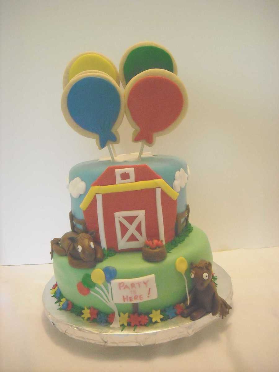 I made this cake for my niece who wanted horses and balloons on her cake. Sugar cookie balloons with buttercream fondant, fondant accents