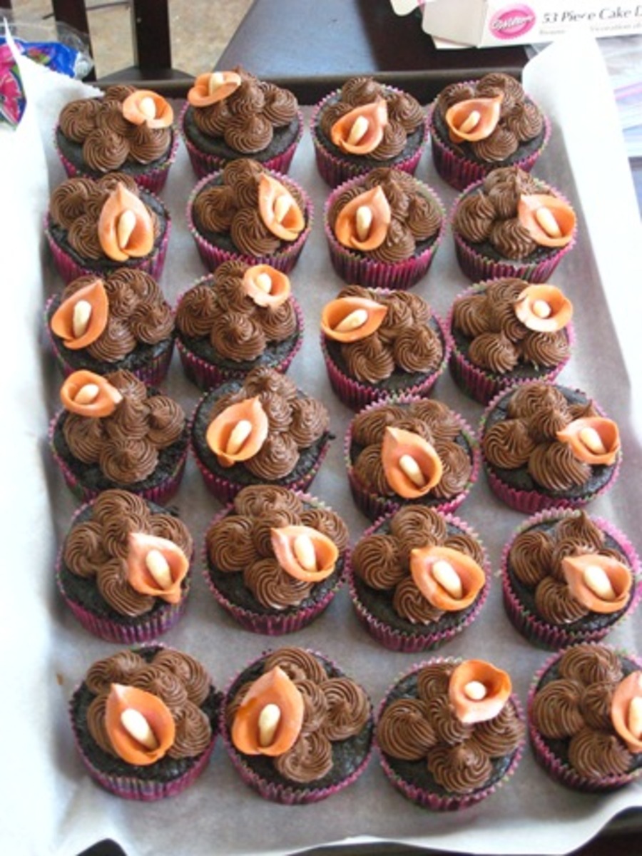vegan chocolate cupcakes: almond custard, chocolate butter cream and gum paste calla lilies.