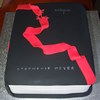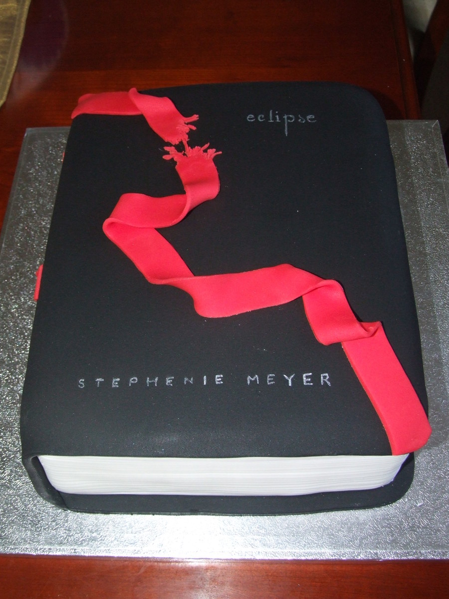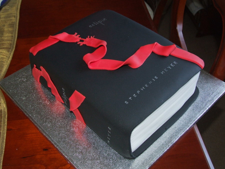 Eclipse Book made from a 8 x 10 sponge cake. Whole cake was covered in white fondant and then I made the book cover with black fondant. writing is done with silver dust and red ribbon to finish.