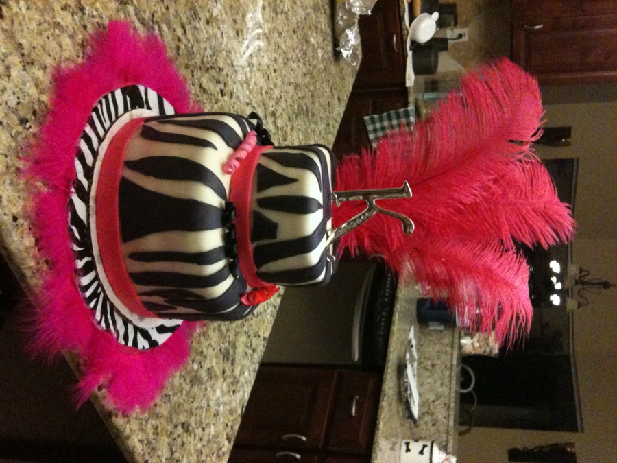Zebra print with hot pink. WASC with buttercream. All fondant except for feathers and "K"