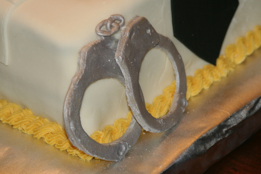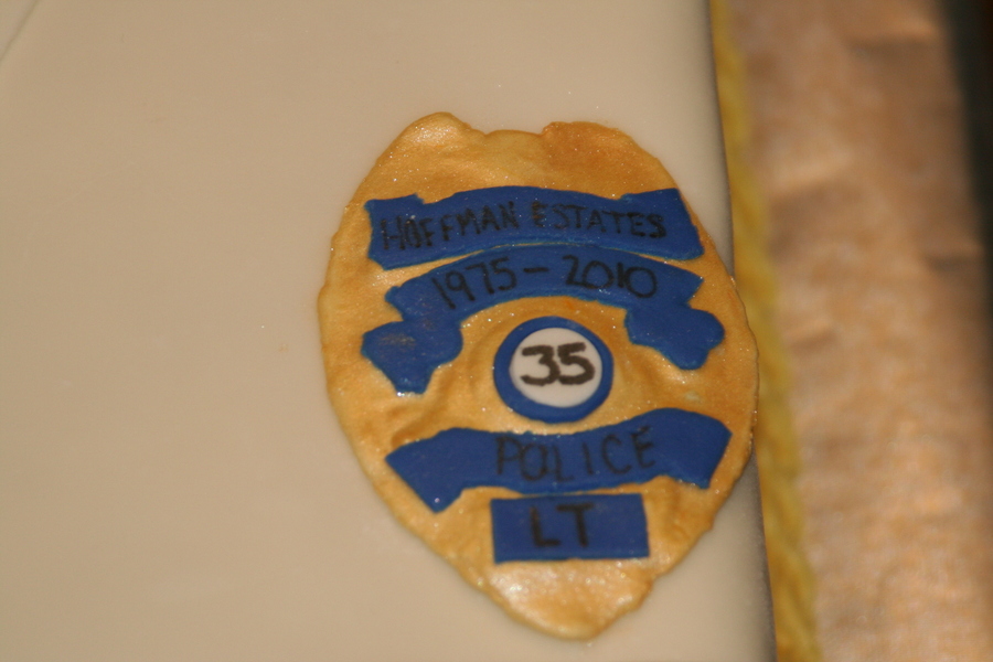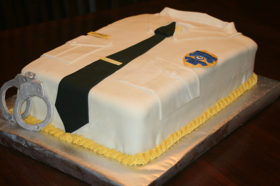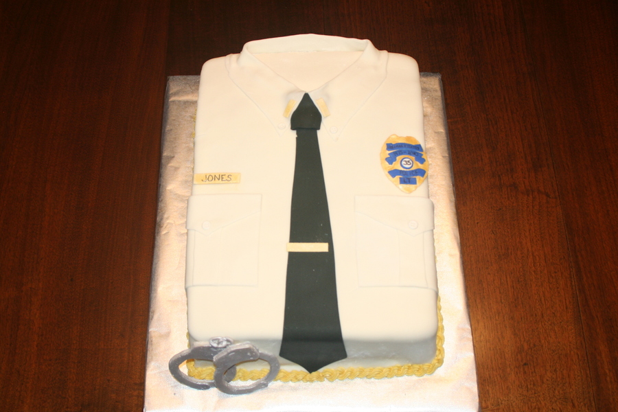 This cake was made for a retirement party for a police Lieutenant. It is a 11 x 15 cake covered in mmf. The badge, name tag, buttons, tie bar, and bars are out of gumpaste and then rest was out of mmf. Thanks for looking!