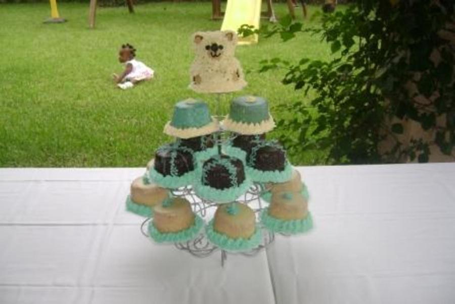 Vanilla cupcakes covered in dark, white and blue chocolate ganache with BC frosting.
