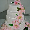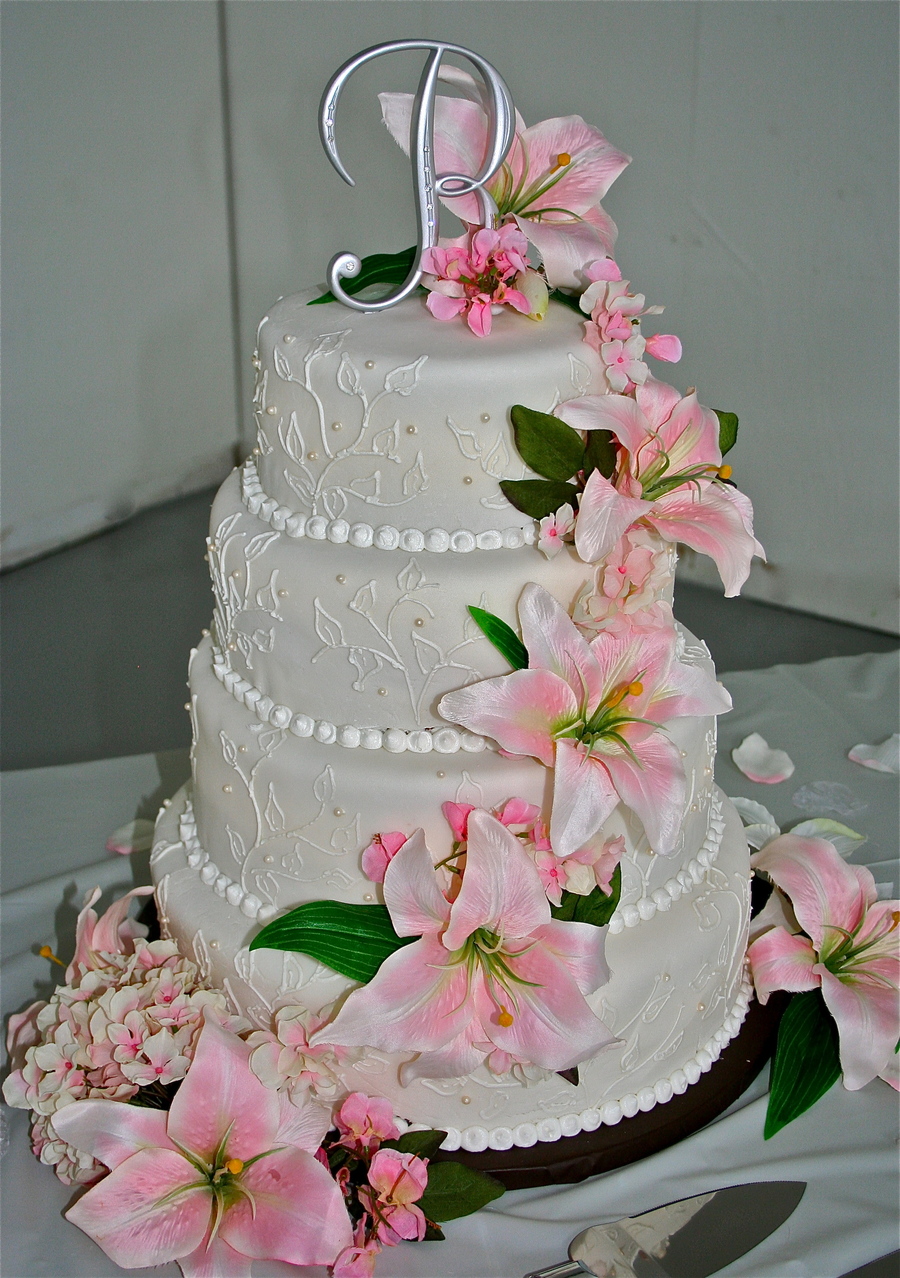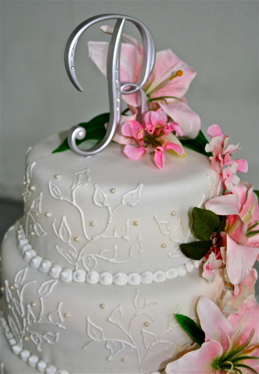 This is an 8 inch, 10 inch, 12 inch, 14 inch round tiered cake covered in Michelle Foster's Fondant. The leaf pattern was drawn by hand using buttercream frosting.