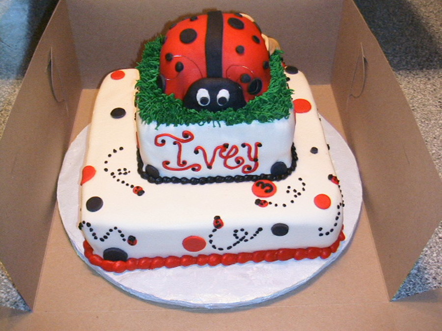 10" and 6" strawberry cakes stacked with BC and MMF. Lady bug is built with cupcakes. Little Ivey's 3rd b Day