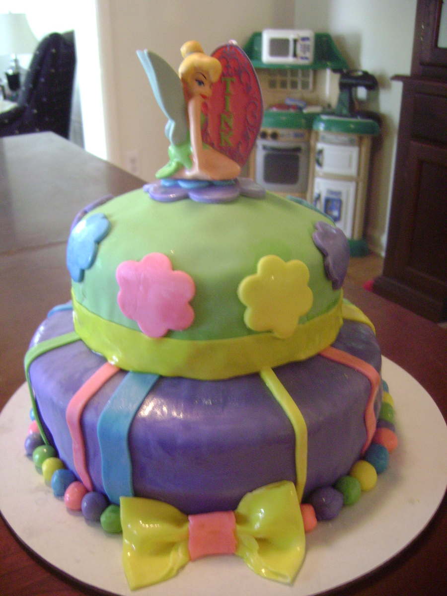 This was a tinkerbell cake I made for my daughter's 4th birthday. We wanted something bright and colorful, but not overwhelming with Tinkerbell. It is all fondant work, including the bow. Tinkerbell is a candle....I didn't trust my ability to make it myself!