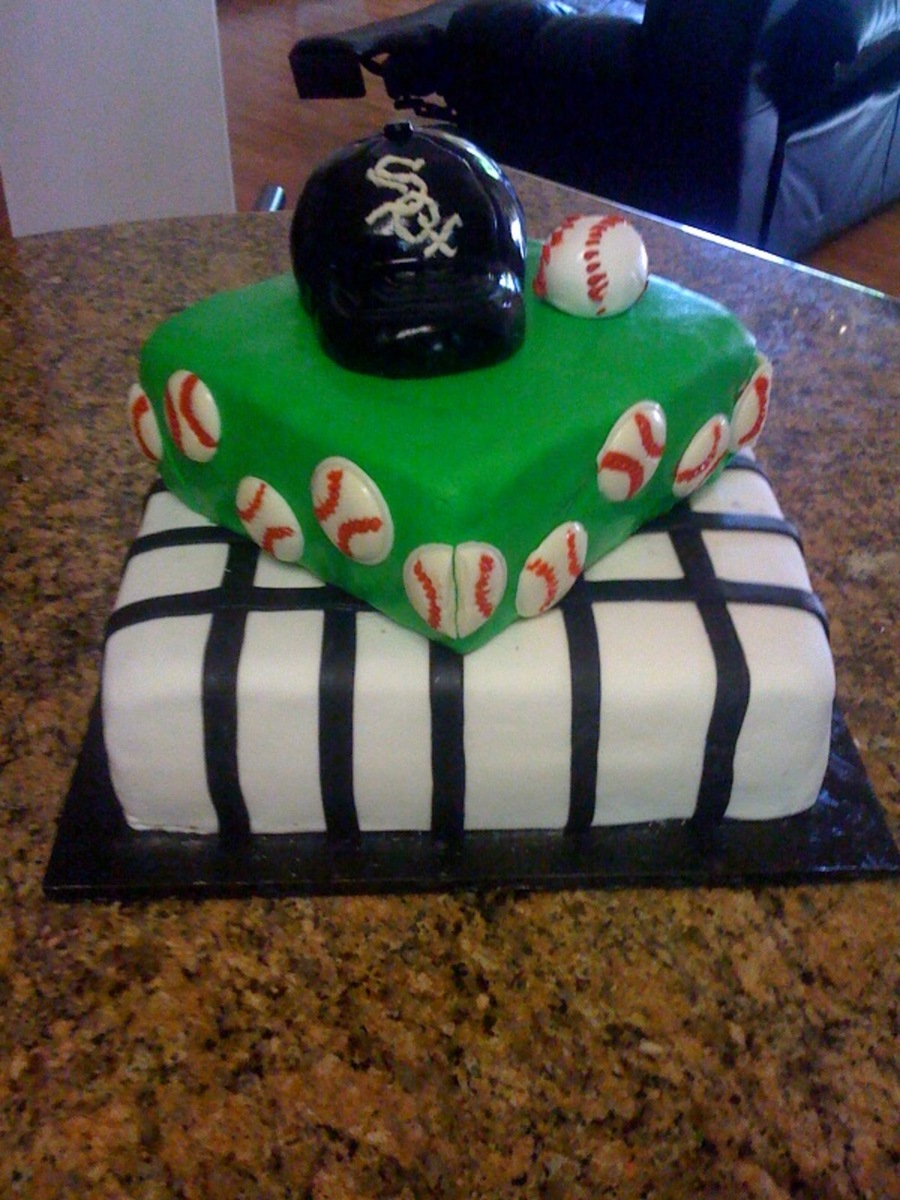 Chocolate cake with strawberry whipped cream filling covered in MMF. Baseballs around the cake made from candy molds. Baseball on top of cake made from MMF and White Sox hat sculpted from rice krispy treats covered in MMF.
