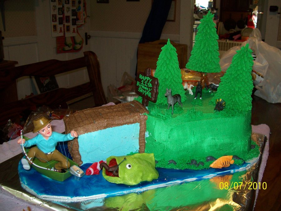 This was a vanilla and chocolate cake for my sons 11th bday. Everything is edible except the fisherman and little plastic animals. The big fish i made with candy clay.