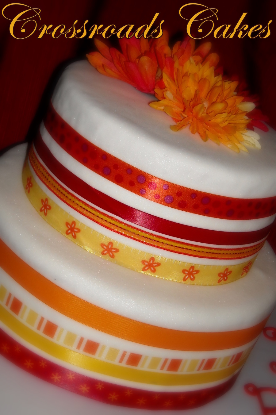 2 tier covered in fondant, ribbon accents. Bottom is red velvet with cream cheese. Top is vanilla bean with espresso icing.