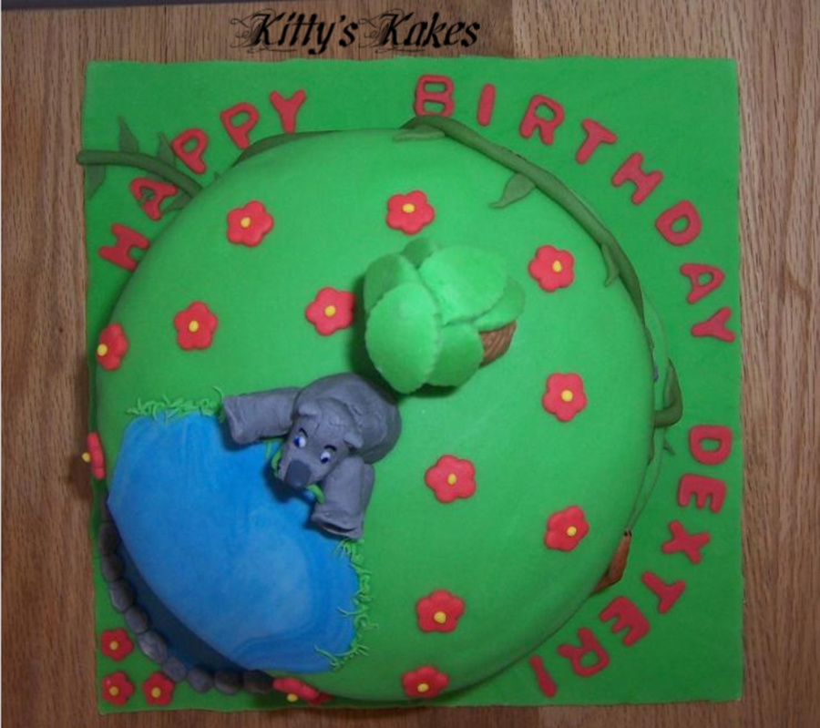 The birthday boy (man actually lol) loves rhinos so he got a rhino/jungle themed cake. The cake is chocolate, chocolate filling with chocolate chips, and covered in chocolate. I made the rhino's skin look all cracked and creased like a real rhino.