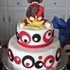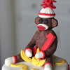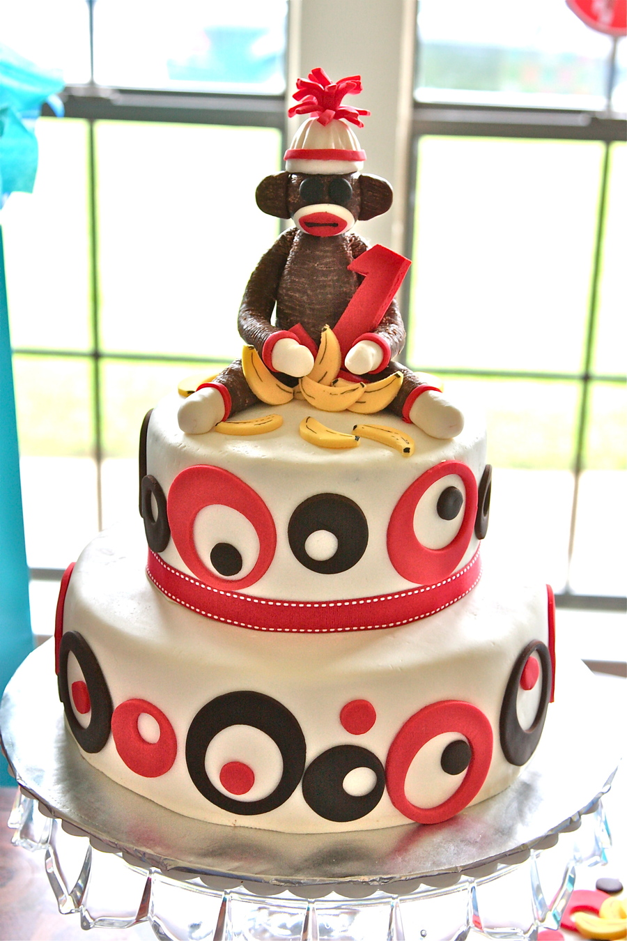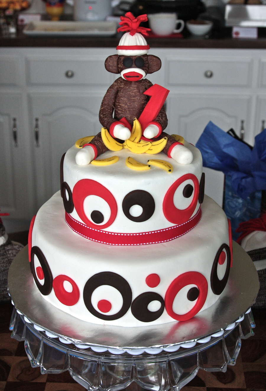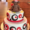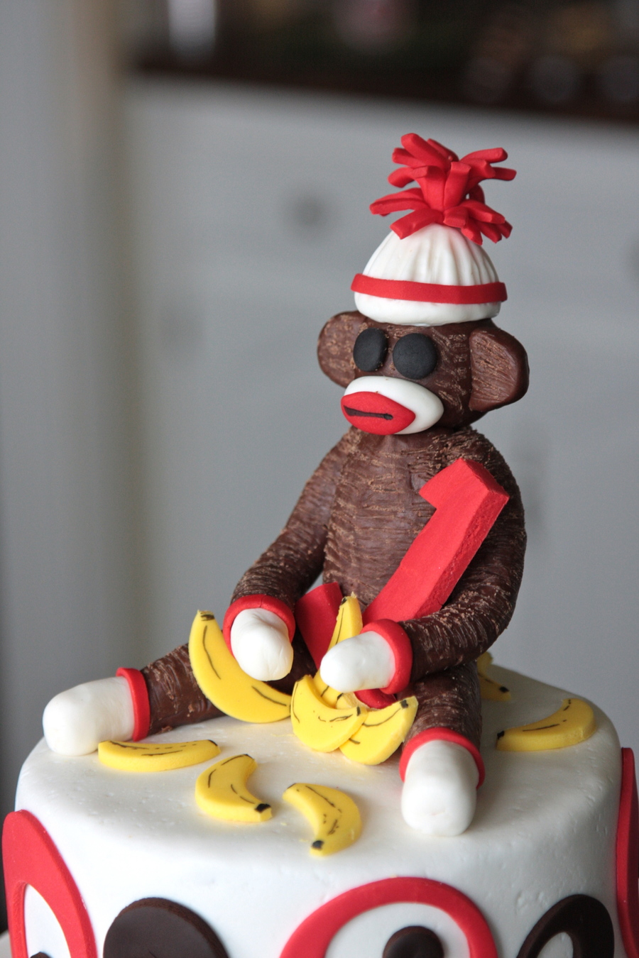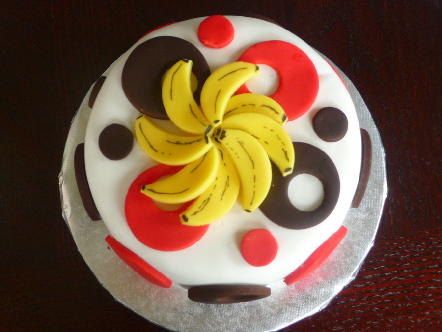 Chocolate cake with banana cream cheese filling, frosted with ganache under fondant.