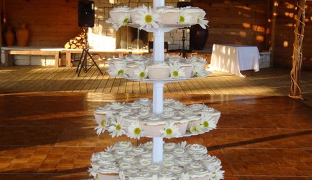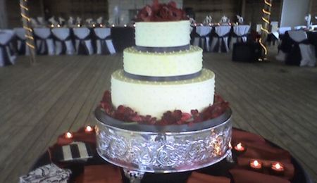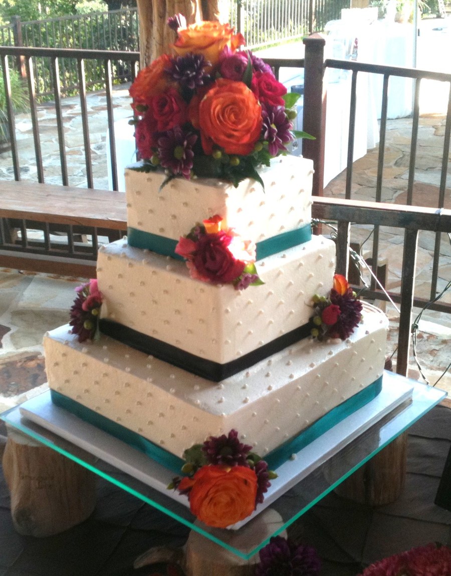 Amaretto bottom tier and top tier, chocolate mint 2nd tier. Vanilla BC with edible pearls in a swiss dot pattern. Real flowers, teal & brown ribbon (what the bride wanted)