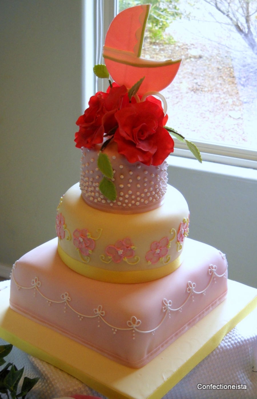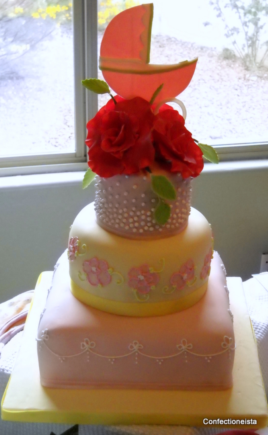 Mom-to-be wanted a feminine, elegant cake. Flowers and carriage are gumpaste. TFL.