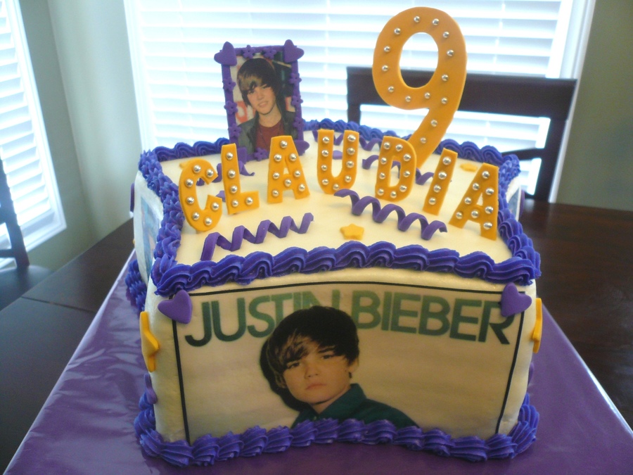 Justin Bieber star cake . JB images all around the cake. Gumpaste name, number and photo frame. This is a strawberry sour cream cake with banana creme bc. yummy!