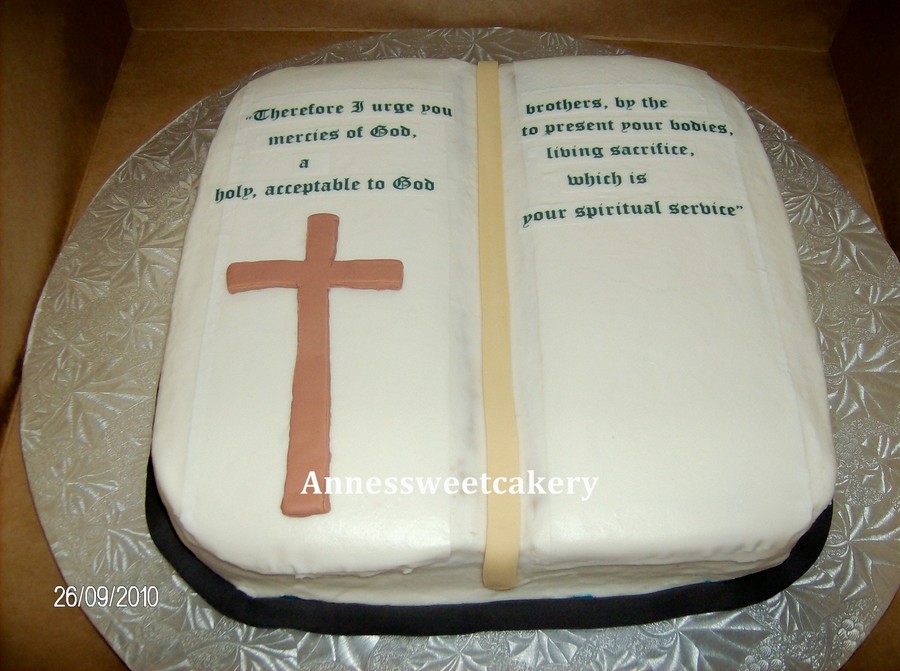 This is my first time making a book cake. It's a bible verse on edible paper, fondant cross, coconut cake with coconut filling, and butter cream icing