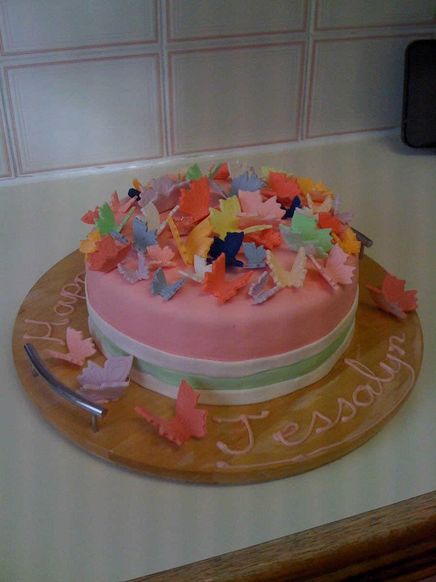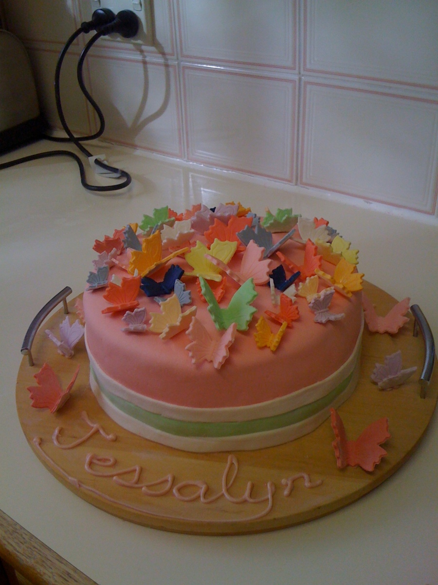 Chocolate cake with vanilla butter cream covered in MMF icing. Butterflies made from MMF.
