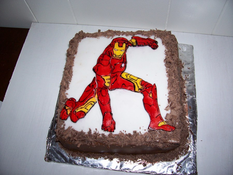 This is a chocolate cake with raspberry filling and chocolate BC frosting. The top is a hand painted fondant cut out of Iron Man I got off the internet. The edges are covered in chocolate shavings. This was for a man so I was trying to make it look more sophisticated.