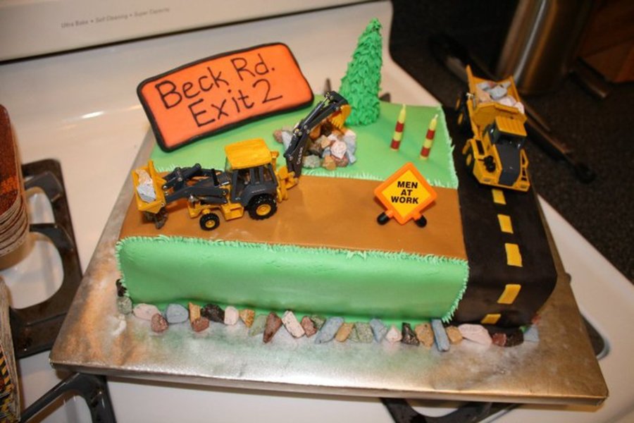 I did this cake for my nephew's birthday. It was 2-9x13 cakes stacked then covered in fondant. Everything on the cake was edible except for the trucks. The chocolate rocks were my favorite.