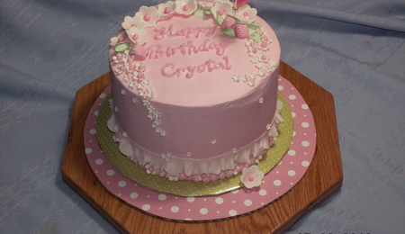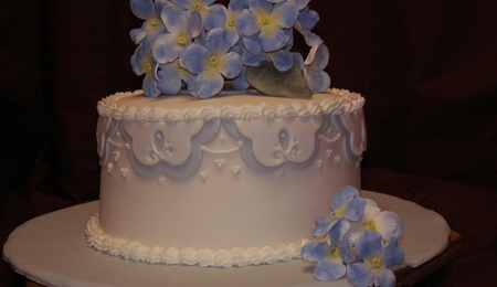 This was the final cake for my Wilton classes. I chose this design from another CC member dolcesunshine20. I loved her design and tried doing it. This was my first attempt at a stacked wedding cake. and first time using fondant. I made gumpaste hydrangia flowers for the top, colored with pedal dust. Thank you dolcesunshine for your design and inspiration. It's not as pretty as yours but I liked the way it turned out.