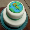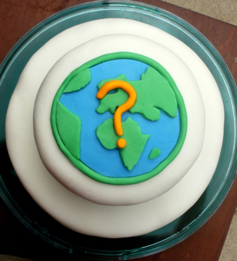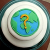 A chocolate butterscotch cake covered in MMF. Decorated with Earth and Question mark