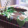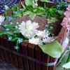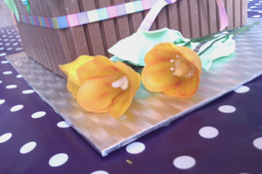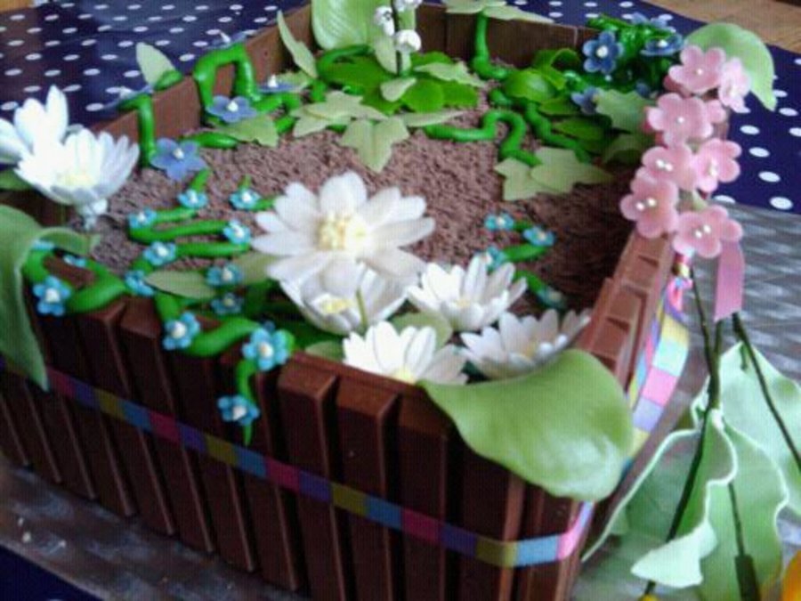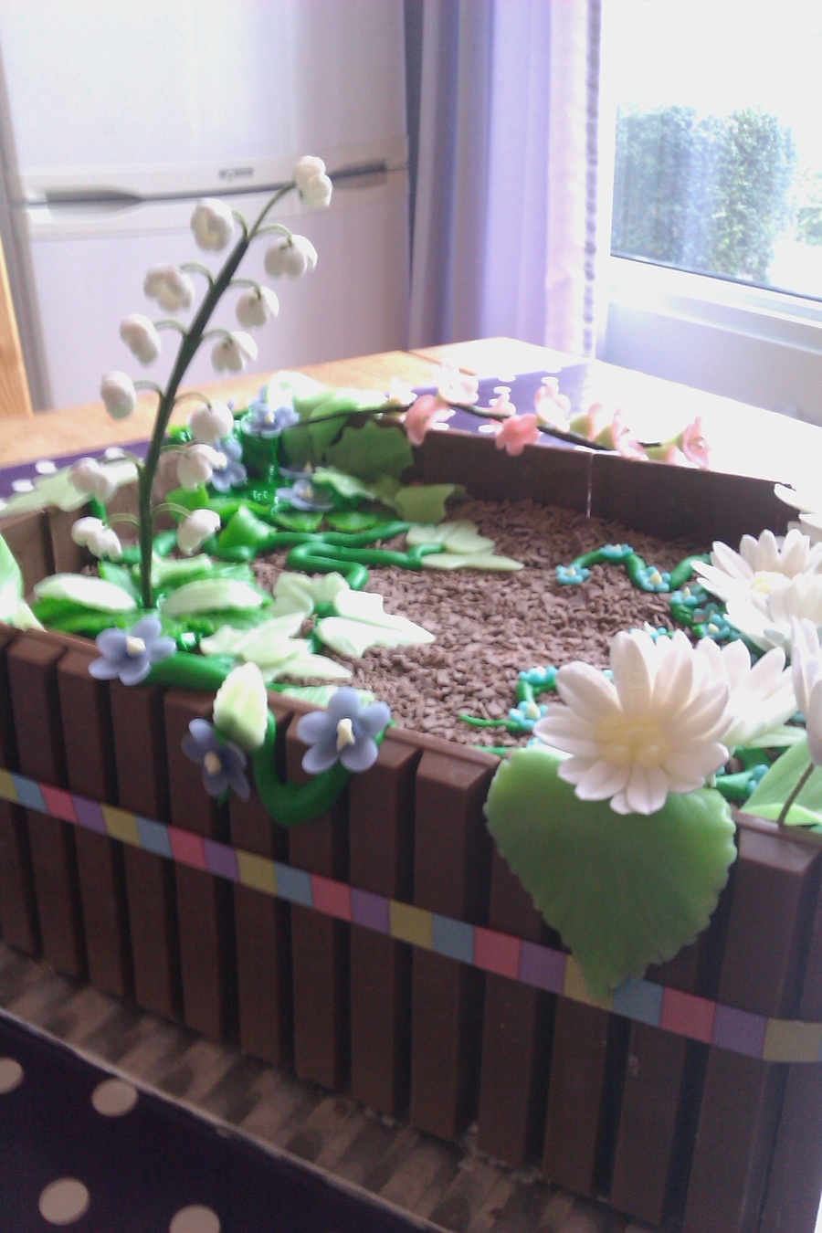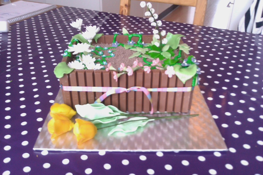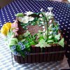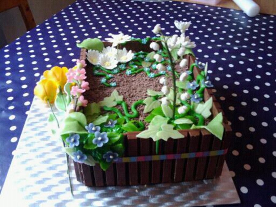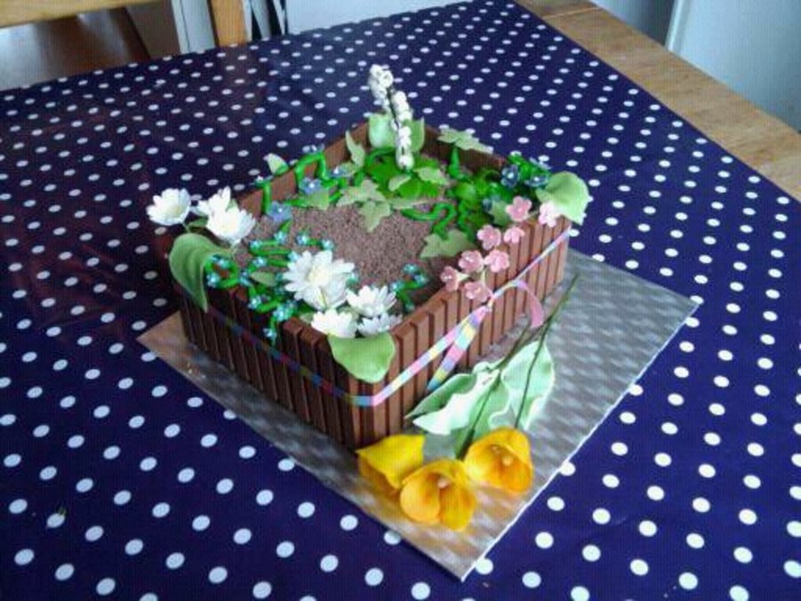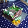 Vanillabiscuit, filled with Tobleronemousse and pear-parts. Decorated with KitKat (dirt) and gumpaste voilets, lily of the valley, marzipan tulips.