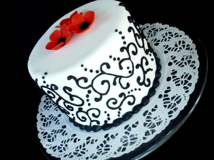Small fondant covered 6" cake with black royal icing and red gumpaste flowers. Kinda like how it turned out...