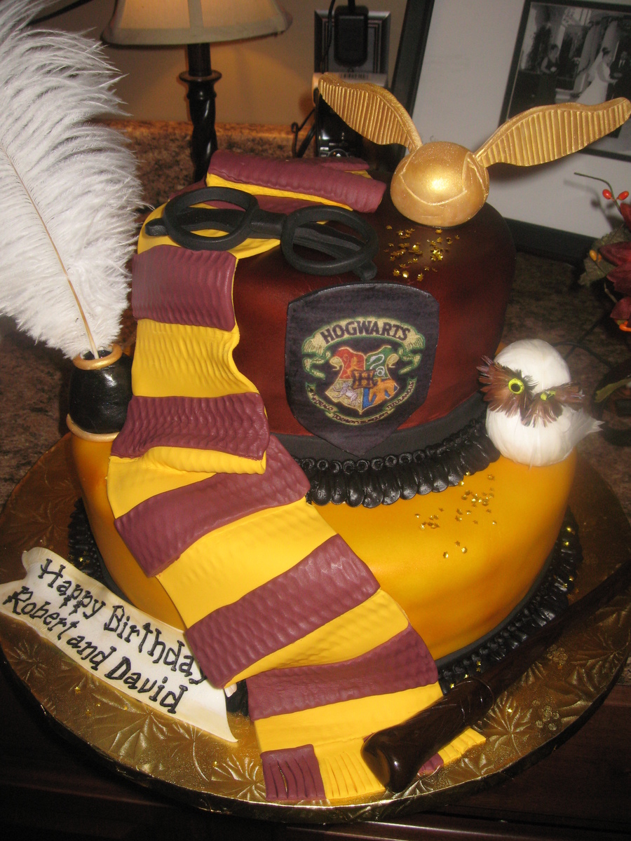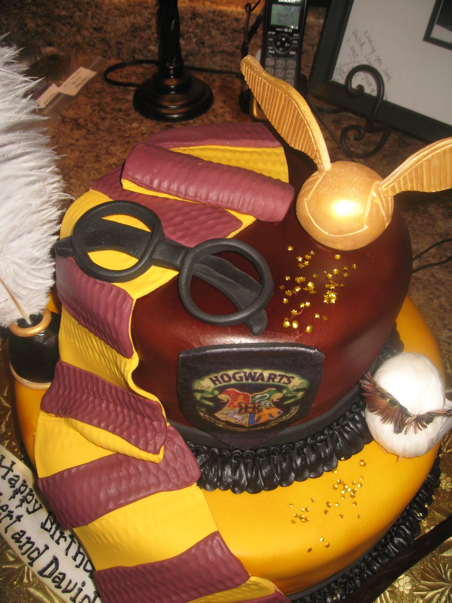 This was a cake done for a Harry Potter themed birthday. All fondant except for the owl and the feather.