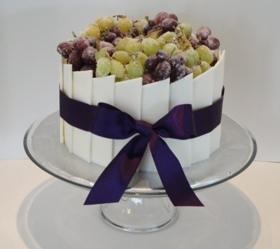 A regular buttercream cake covered in white chocolate panels (I hand cut each one) and topped with sugared grapes. Tied with a fabric ribbon