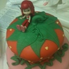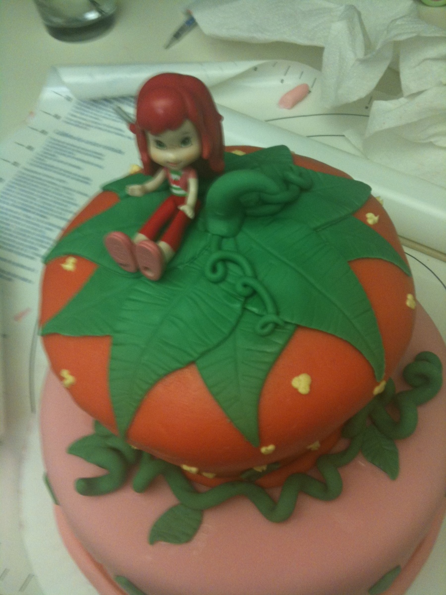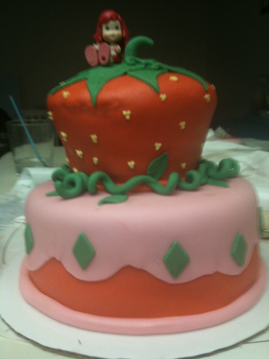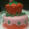 Vanilla cake with fresh strawberry frosting filling, covered in fondant.