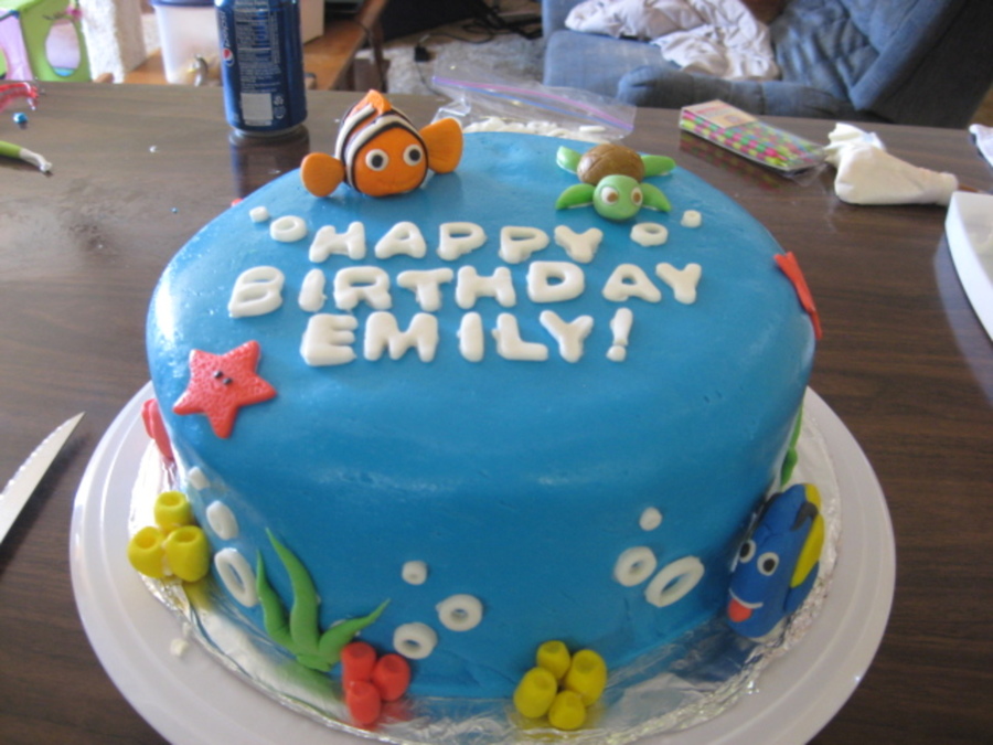 Finding Nemo cake for a three year old's birthday. Characters and decorations handmade with gumpaste.