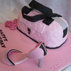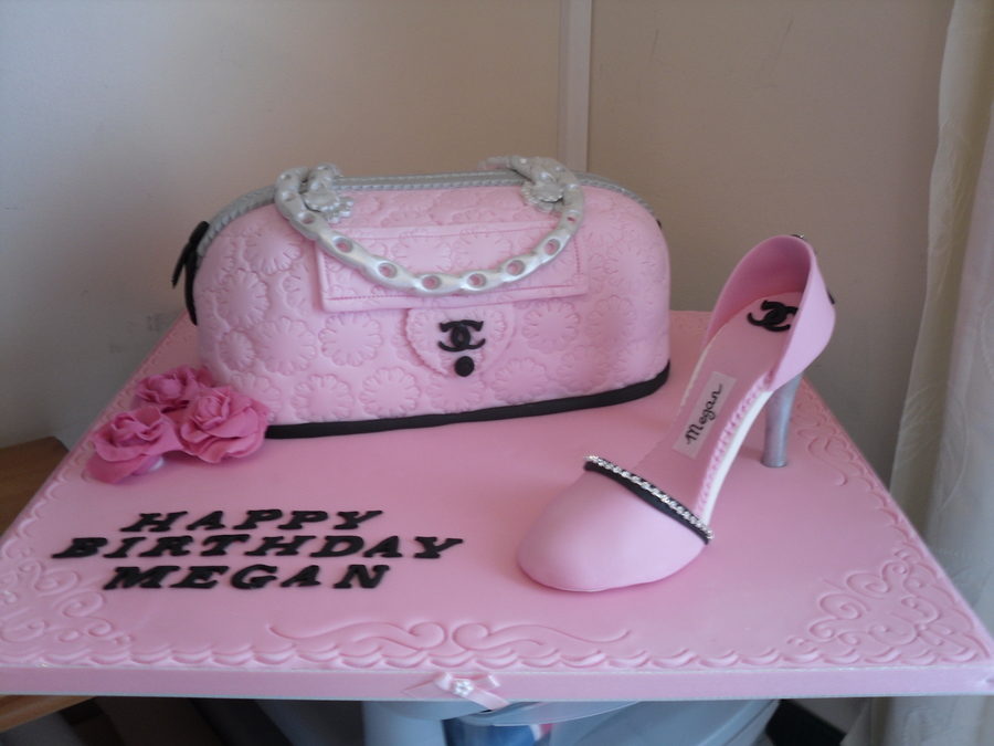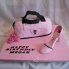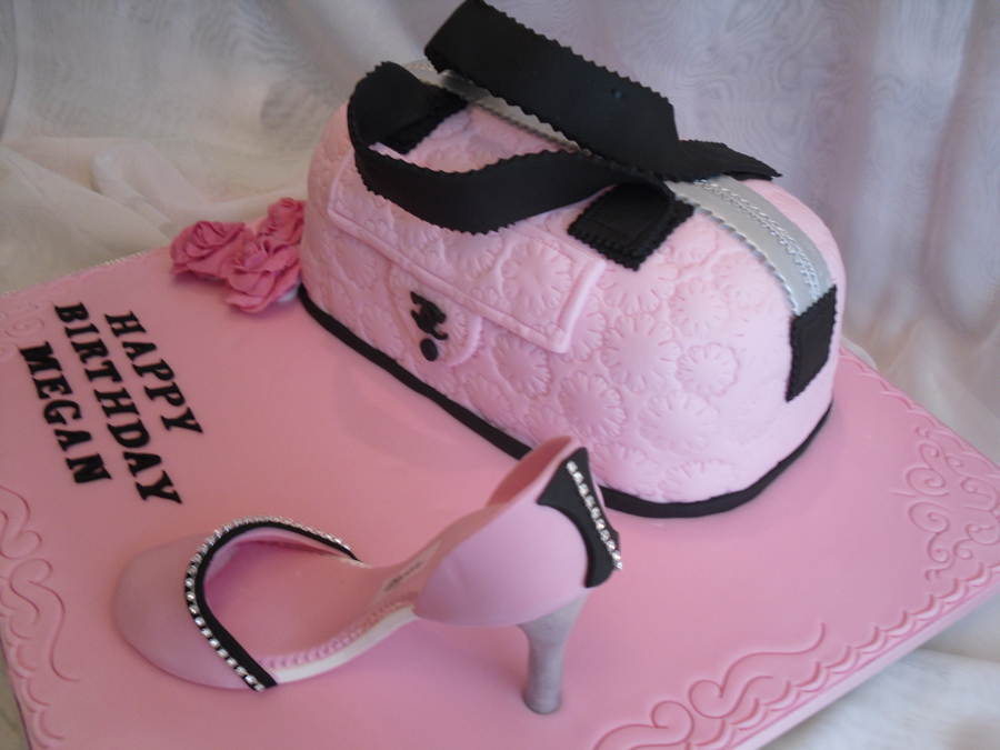 Vanilla sponge with buttercream and white chocolate ganache. Had a nightmare with the black handles which collapsed just before delivery. Thank goodness it was a dear friends cake. I asked them to give me an hour, and I then took off the black handles, covered the slight black marks with a pink cutout and made a chain handle and silvered it all within 20 mins. Someone up there was really guiding me those last few minutes. Phew, I needed a nice glass of wine after that.