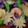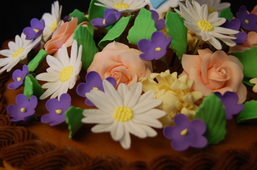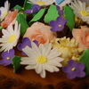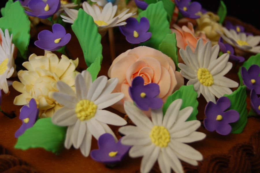 This is the first time making roses, mums, daisies and violets out of gumpaste....it was an adventure. I really like how the two-tone basket weave turned out. TFL.