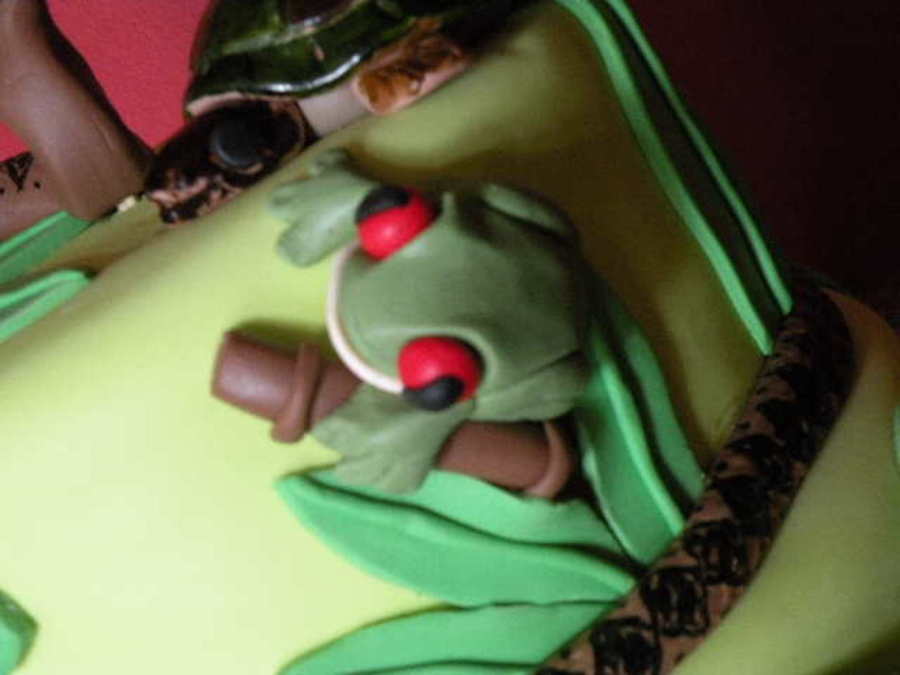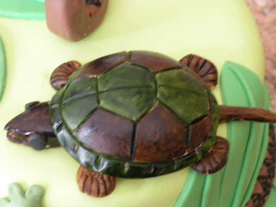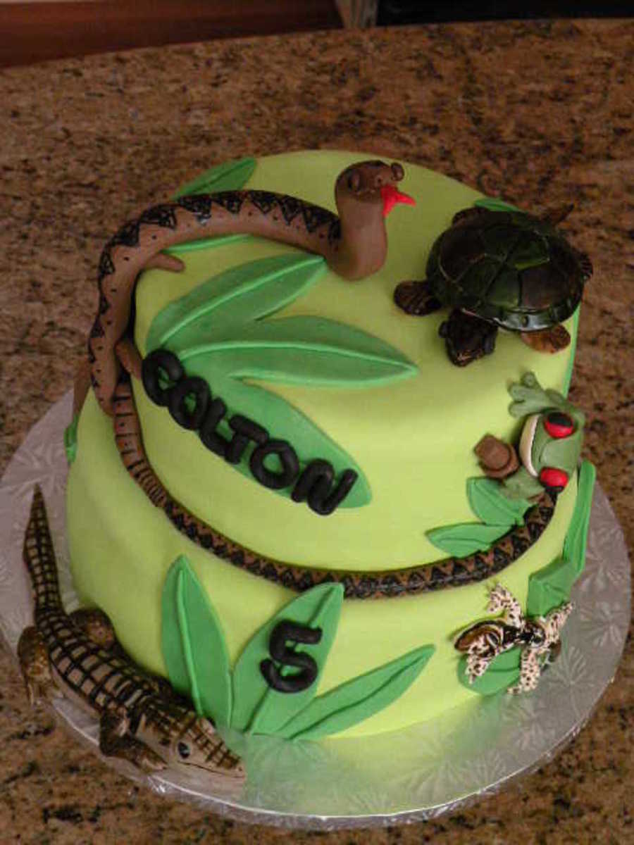 For a 5 yr old's bday with a reptile theme. 8in WASC with whipped raspberry over 10in Chocolate with caramel BC, covered in fondant. All hand-molded fondant reptiles (and a frog).