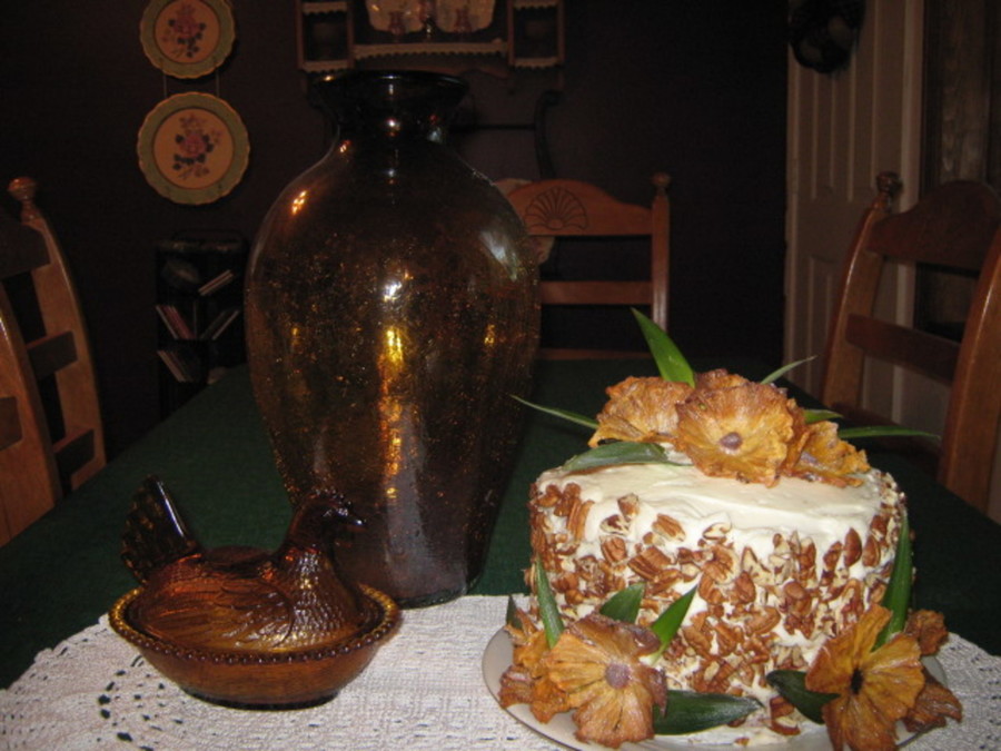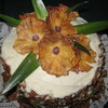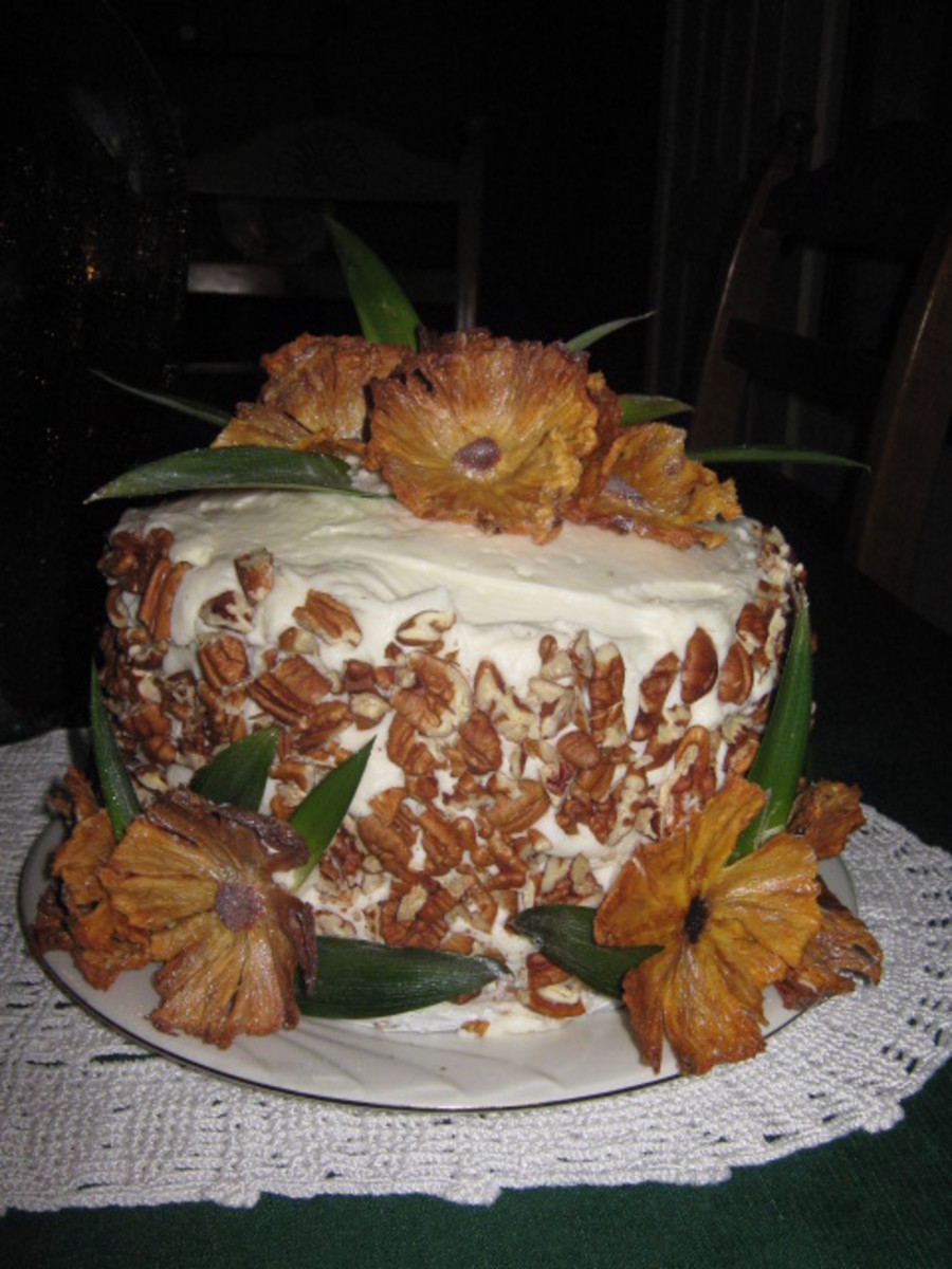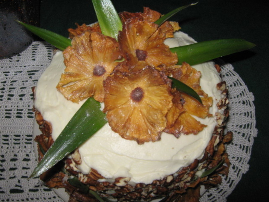Hummingbird cake:3-- 8 inch layers with cream cheese frosting between them..cake is crushed pineapple, bananas,coconut and pecans, the outside if frosted with cream cheese and decorated with fresh pineapple oven dried and real pineapple leaves.