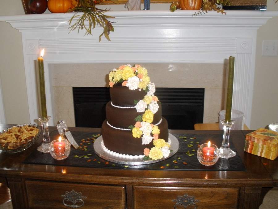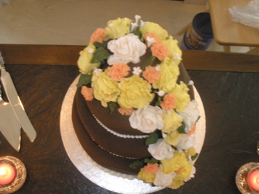 This is a cake I made for a party my husband's family threw to celebrate our wedding. It's a chocolate stout cake with an amaretto mocha buttercream covered in chocolate fondant and decorated with gumpaste flowers. It was a big hit! thx for looking! :)