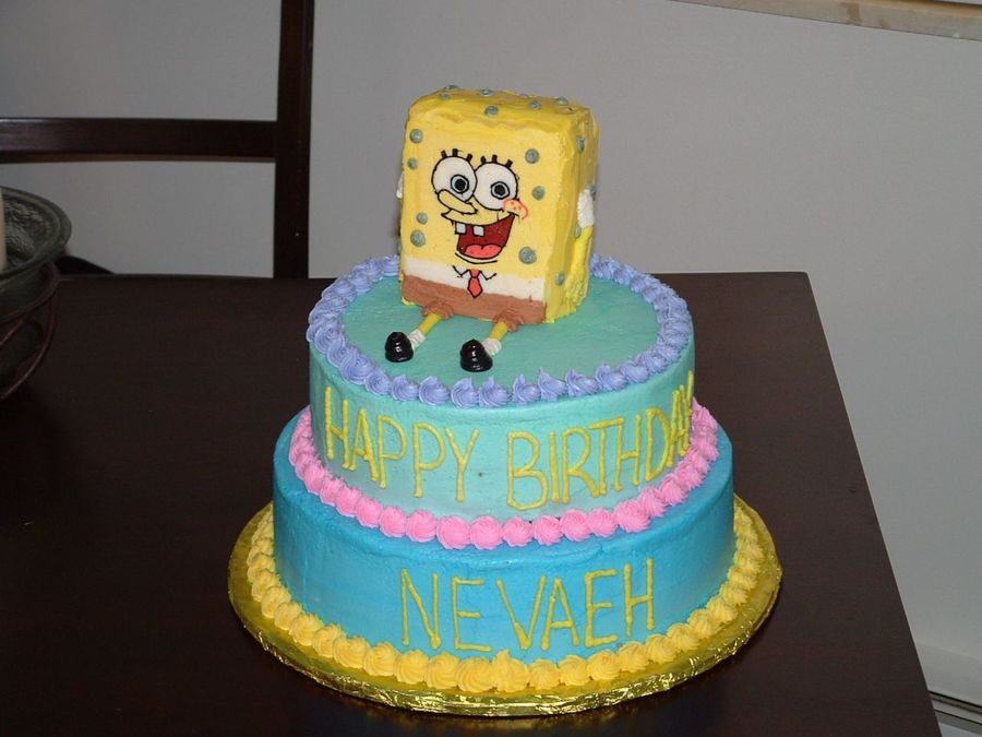 Sponge bob is a BCT on chocolate cake. I made a mistake by putting the cake back in the freezer for a few moments because condensation made the black run a little. I learned a lot while doing this cake and feel if I did it again it would be a lot better.