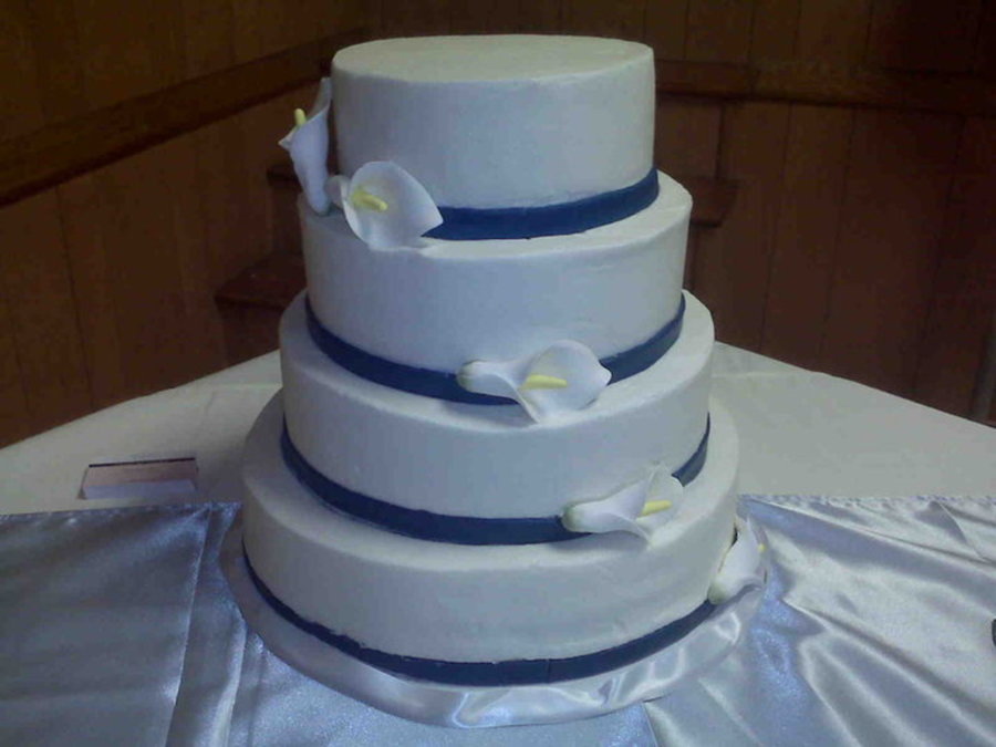 This in an all vanilla.buttercream cake with gum paste calla lilies. 14", 12", 10" and 8" rounds. 4" high triple layer vanilla cake with vanilla buttercream. Fondant blue border.