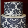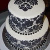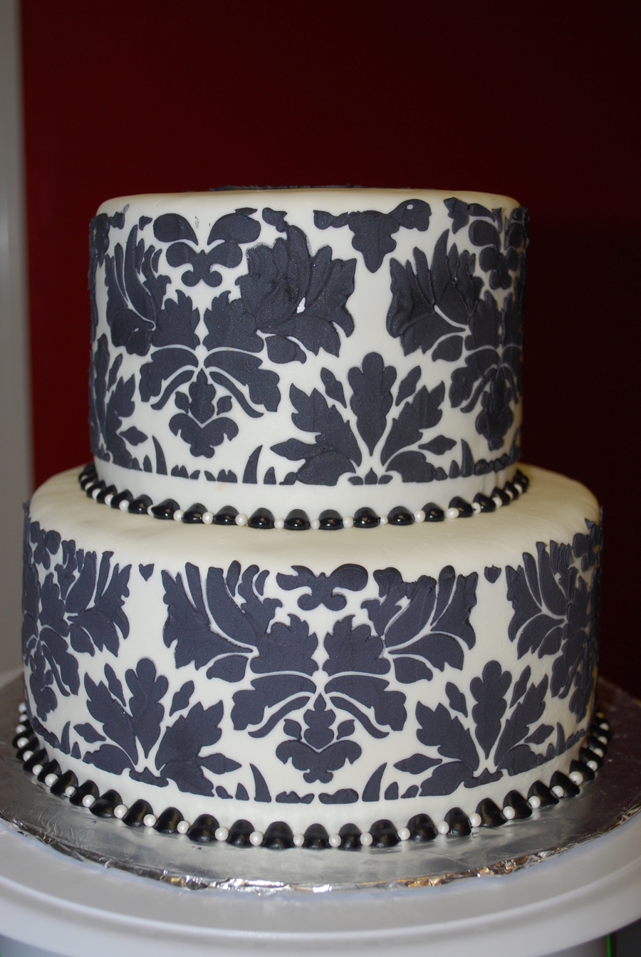 Cake to match wedding invitations for a bridal shower. My first attempt at stenciling, stenciled and bordered with royal icing and edible pearls.