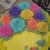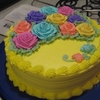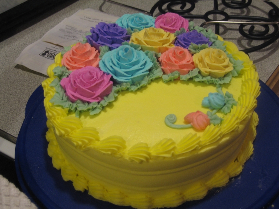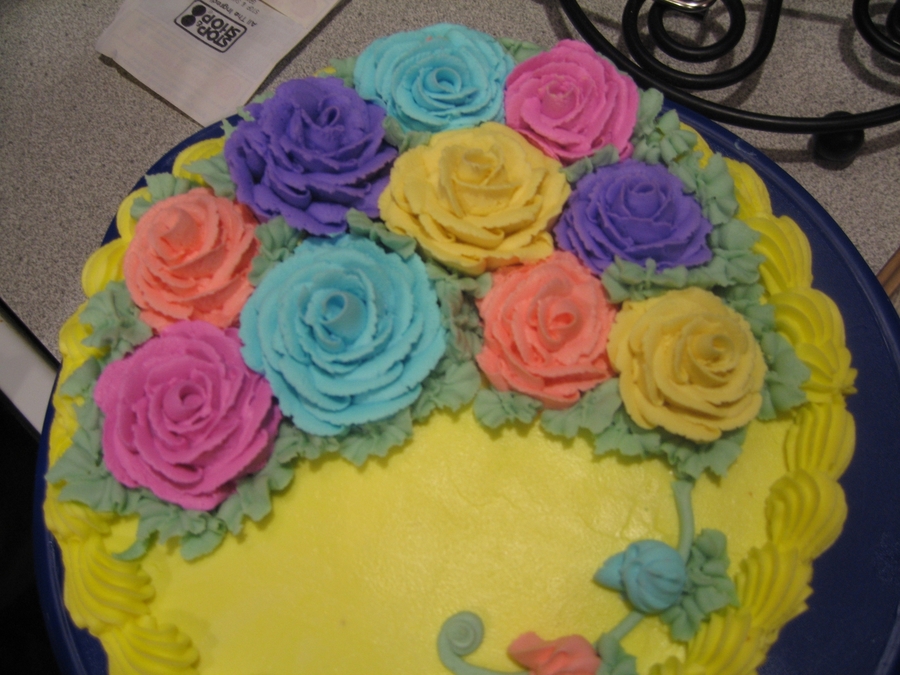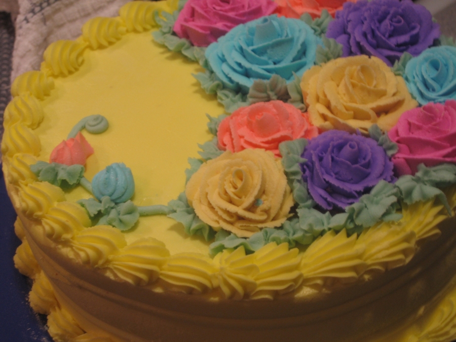 white cake with strawberry filling. Buttercream frosting and flowers.