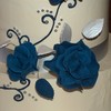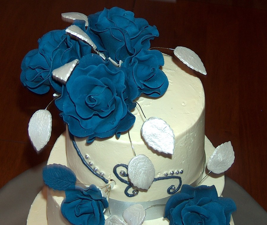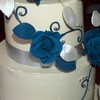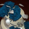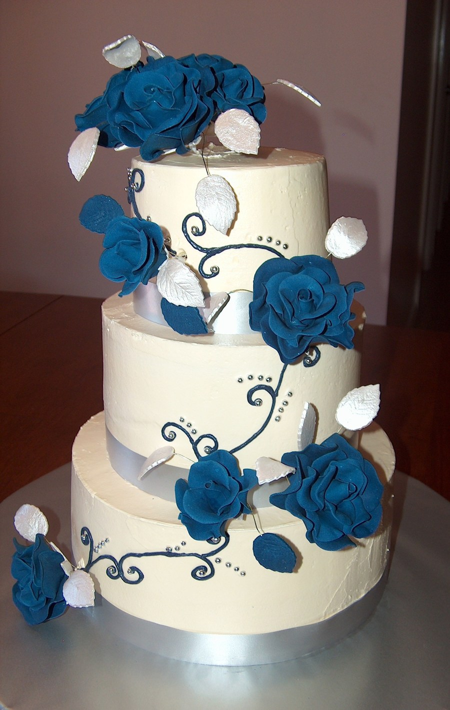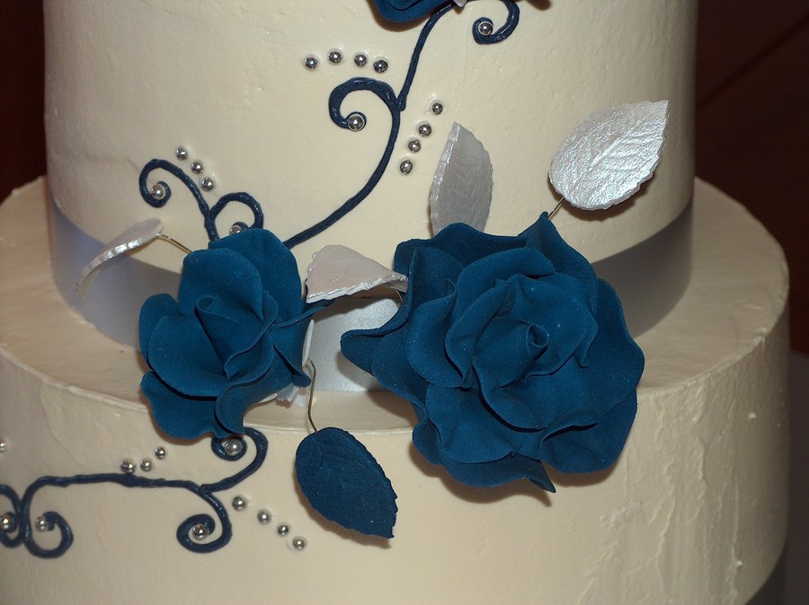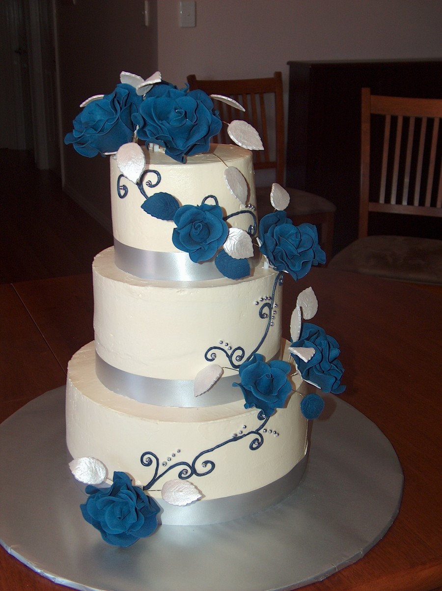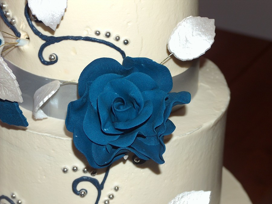 My first wedding cake. I was so pleased with how it turned out. The cake details. Bottom tier is chocolate cake, middle tier is vanilla cake, top tier is chocolate cake. It has all been filled and frosted in buttercream. The blue roses I made myself for the first time in this manner by watching Edna's tutorial at designmeacake.com. The blue roses were to match the bridesmaides blue dresses. The silver ribbon at the bottom of the cakes are to match silver borders on the invitations. The blue scrolls are done in buttercream. And another pop of silver from the silver dragees