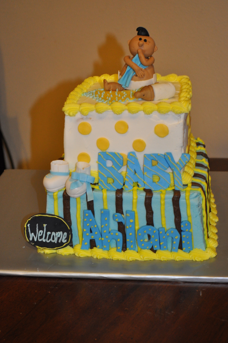 They wanted a cake to look exactly like a cake they found on the internet. Baby was made out of gumpaste and so were the booties...iced and decorated in butter cream