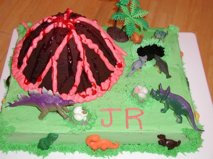 Iced in buttercream. volcano is chocolate cake with buttercream and red gel. Dinosaurs around bottom edge are candy melts, other dinosaurs are plastic.